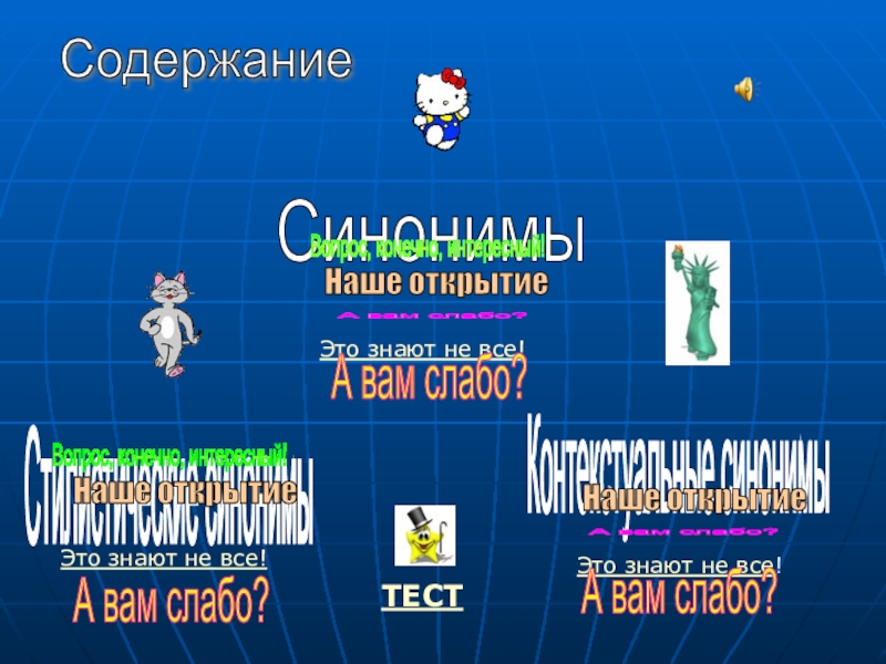 Это сайт презентаций, где можно хранить и обмениваться своими презентациями, докладами, проектами, шаблонами в формате PowerPoint с другими пользователями. Мы помогаем школьникам, студентам, учителям, преподавателям хранить и обмениваться учебными материалами.