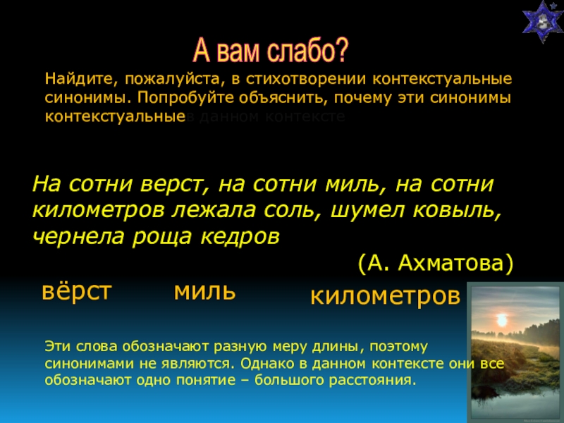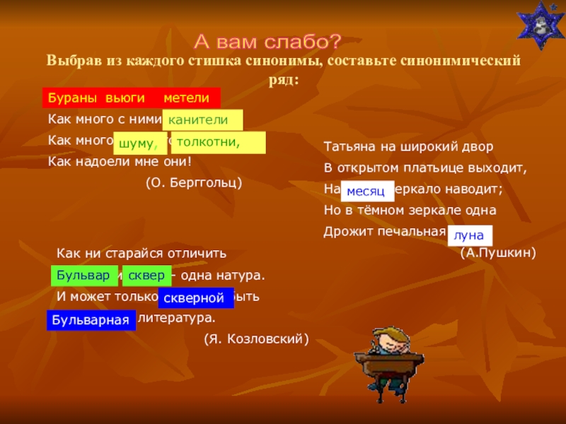 Найдите, пожалуйста, в стихотворении контекстуальные синонимы. Попробуйте объяснить, почему эти синонимы контекстуальныев данном контексте