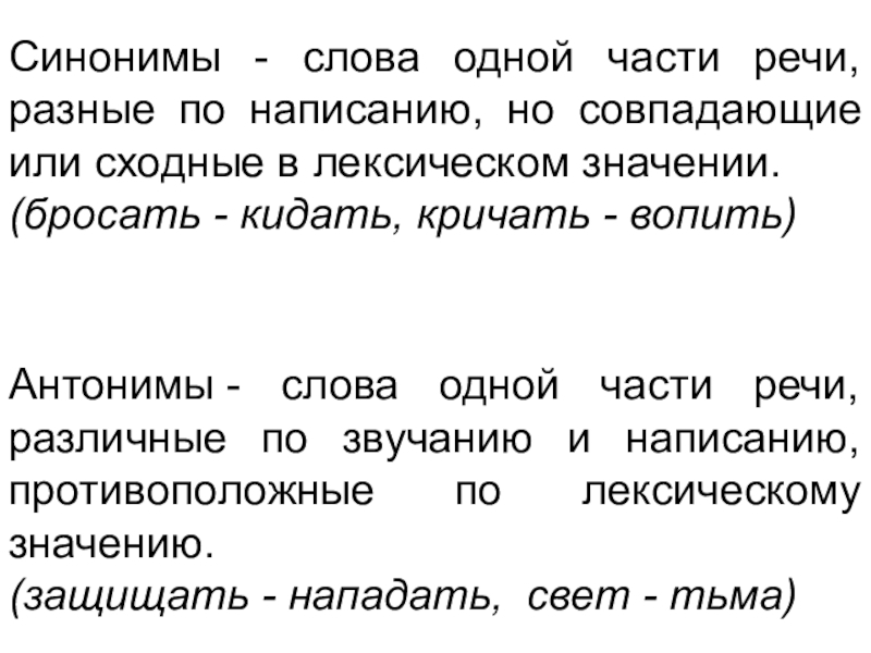 Антонимы - слова одной части речи, различные по звучанию и написанию, противоположные по лексическому значению.