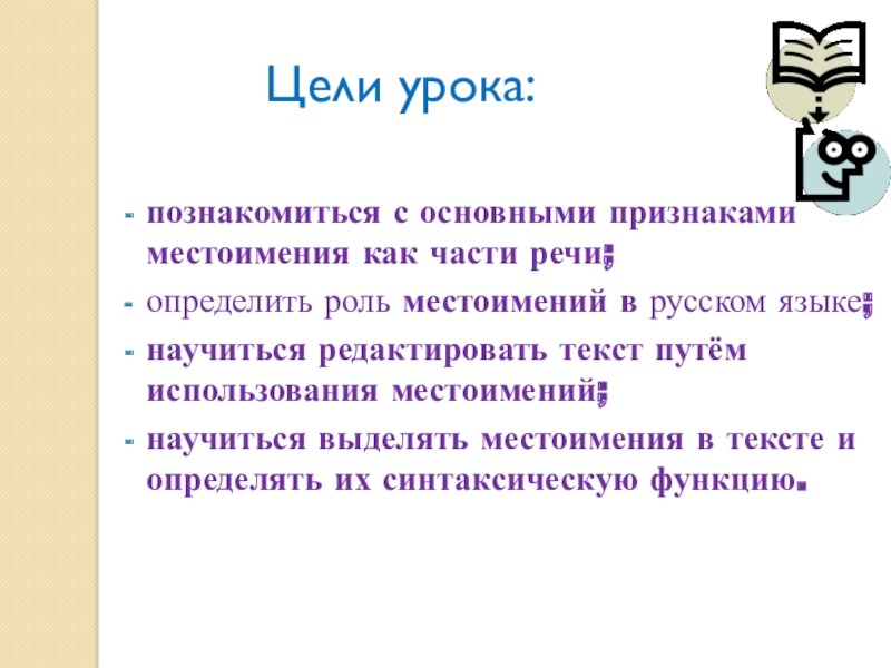 научиться выделять местоимения в тексте и определять их синтаксическую функцию.