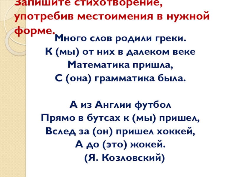 Слайд 19Запишите стихотворение, употребив местоимения в нужной форме.