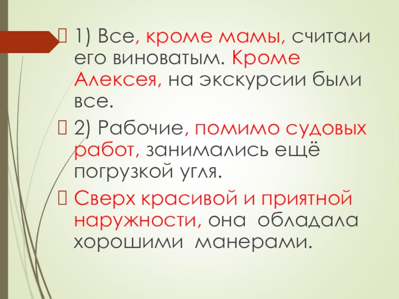 Слайд 71) Все, кроме мамы, считали его виноватым. Кроме Алексея, на экскурсии