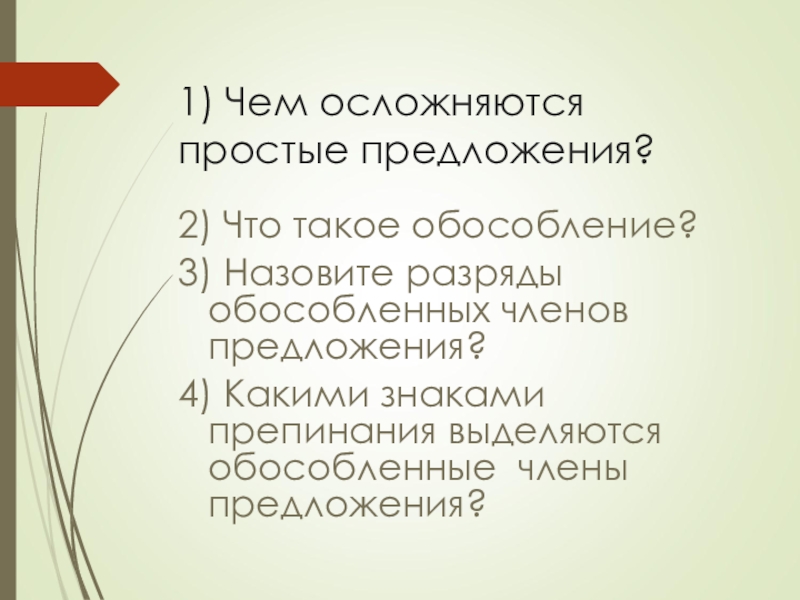 1) Чем осложняются простые предложения?2) Что такое обособление?3) Назовите разряды обособленных членов предложения?4) Какими знаками препинания выделяются