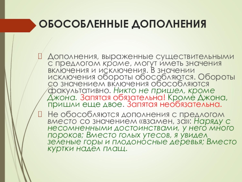 ОБОСОБЛЕННЫЕ ДОПОЛНЕНИЯ Дополнения, выраженные существительными с предлогом кроме, могут иметь значения включения и исключения. В значении исключения