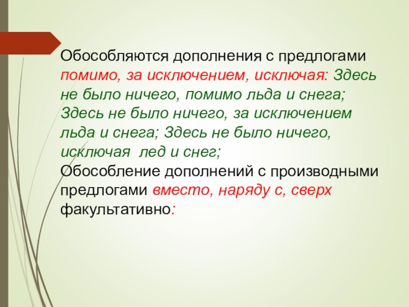 Обособляются дополнения с предлогами помимо, за исключением, исключая: Здесь не было ничего, помимо льда и снега; Здесь