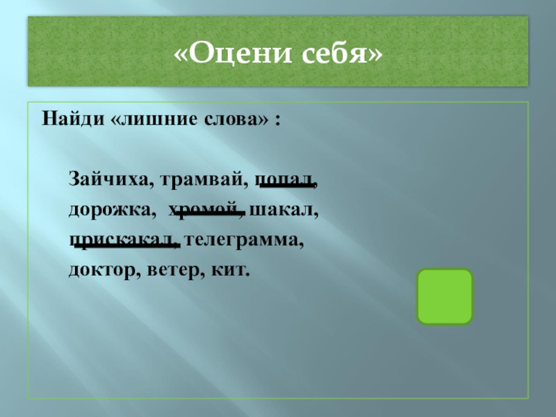 «Оцени себя»Найди «лишние слова» :   Зайчиха, трамвай, попал,   дорожка, хромой, шакал,