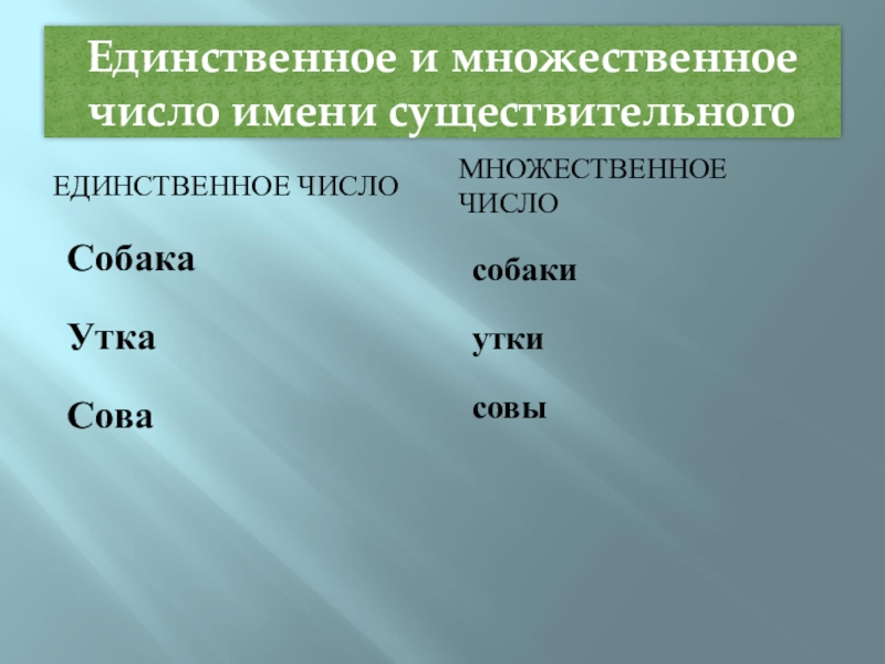 Единственное и множественное число имени существительногоЕДИНСТВЕННОЕ ЧИСЛОМНОЖЕСТВЕННОЕ ЧИСЛОСобакаУтка Сова собакиуткисовы