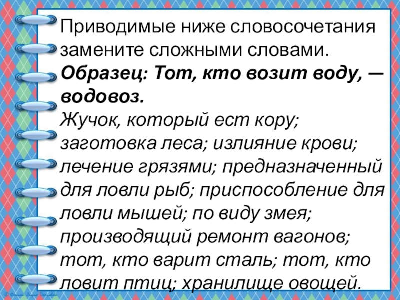 который ест кору; заготовка леса; излияние крови; лечение грязями; предназначенный для ловли рыб; приспособление для ловли мышей; по виду змея; производящий ремонт вагонов; тот, кто варит сталь; тот, кто ловит птиц; хранилище овощей.