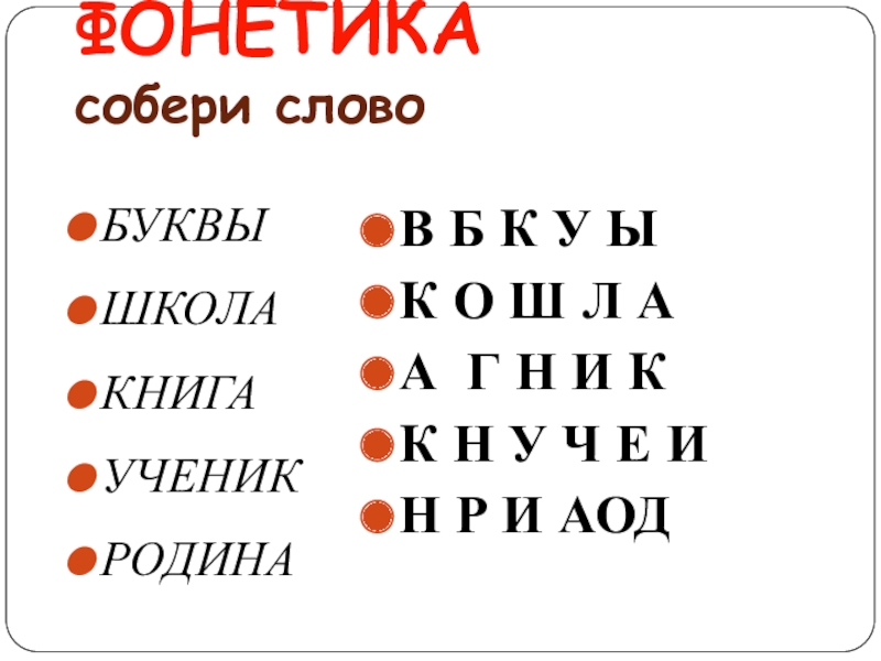 ФОНЕТИКА собери словоБУКВЫШКОЛАКНИГАУЧЕНИКРОДИНАВ Б К У Ы К О Ш Л АА Г Н И К