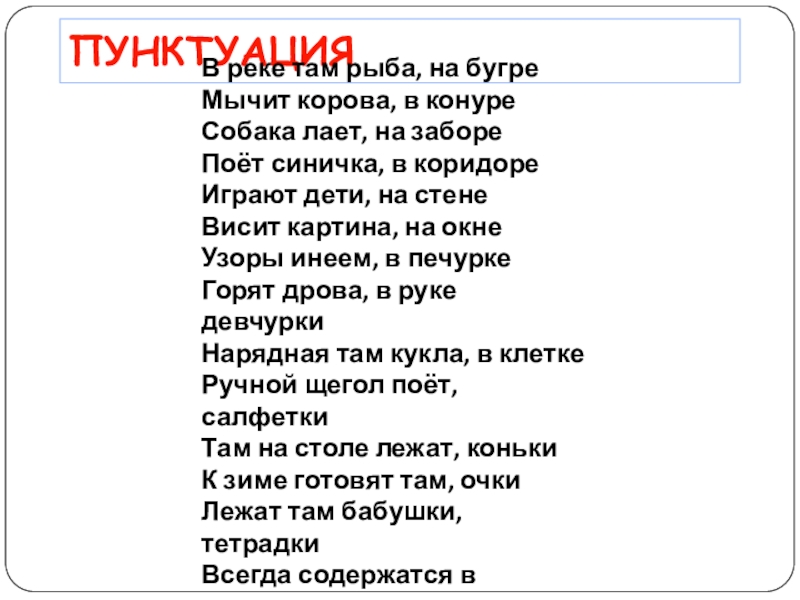 ПУНКТУАЦИЯВ реке там рыба, на бугреМычит корова, в конуреСобака лает, на забореПоёт синичка, в коридореИграют дети, на