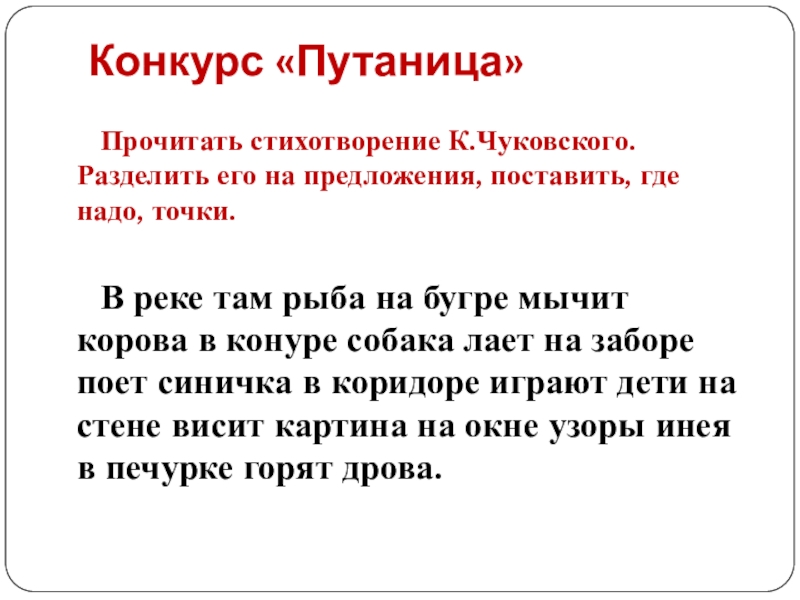 Конкурс «Путаница»Прочитать стихотворение К.Чуковского. Разделить его на предложения, поставить, где надо, точки.В реке там рыба на бугре мычит корова в конуре собака лает на заборе поет синичка в коридоре играют дети на стене висит картина на