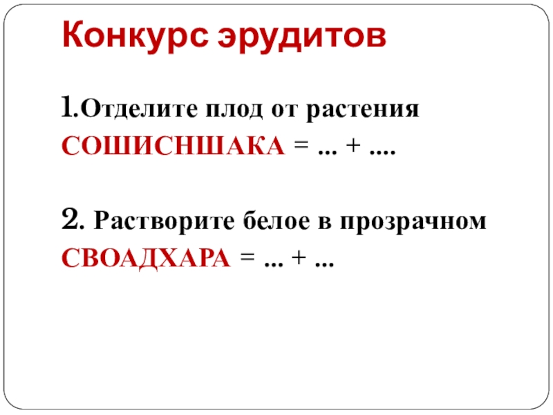 Конкурс эрудитов1.Отделите плод от растенияСОШИСНШАКА = … + ….2. Растворите белое в прозрачномСВОАДХАРА = … + …