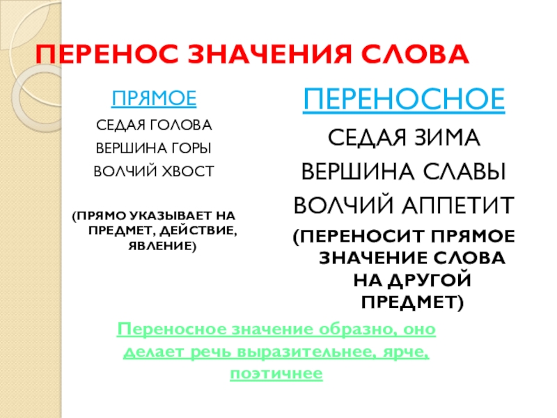 Переносное значение образно, оно делает речь выразительнее, ярче, поэтичнее