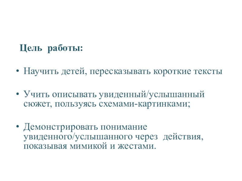 Цель работы: Научить детей, пересказывать короткие текстыУчить описывать увиденный/услышанный сюжет, пользуясь схемами-картинками;Демонстрировать понимание увиденного/услышанного через действия,показывая