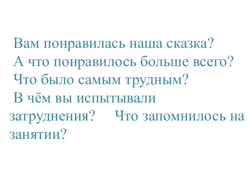 Вам понравилась наша сказка? А что понравилось больше всего? Что было самым трудным? В чём вы испытывали
