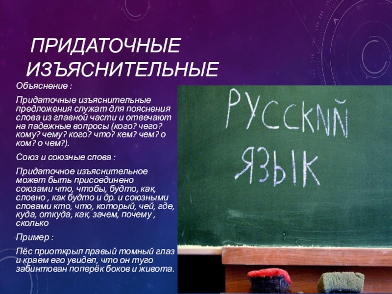 Придаточные изъяснительные предложения служат для пояснения слова из главной части и отвечают на падежные вопросы (кого? чего? кому? чему? кого? что? кем? чем? о ком? о чем?).
