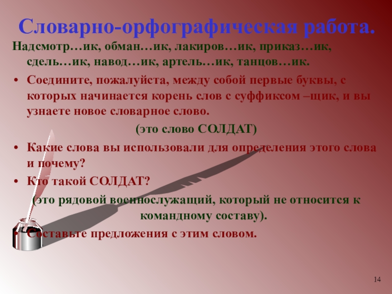 собой первые буквы, с которых начинается корень слов с суффиксом –щик, и вы узнаете новое словарное слово.