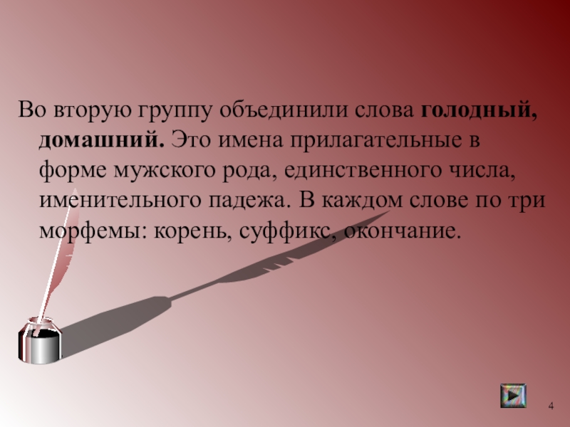 Во вторую группу объединили слова голодный, домашний. Это имена прилагательные в