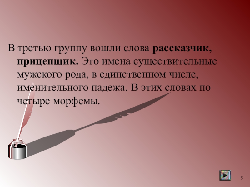 В третью группу вошли слова рассказчик, прицепщик. Это имена существительные мужского