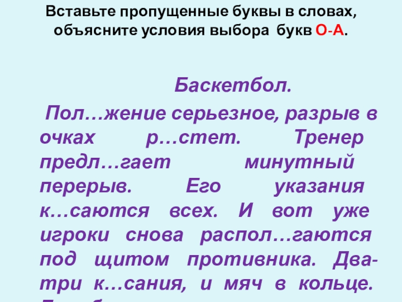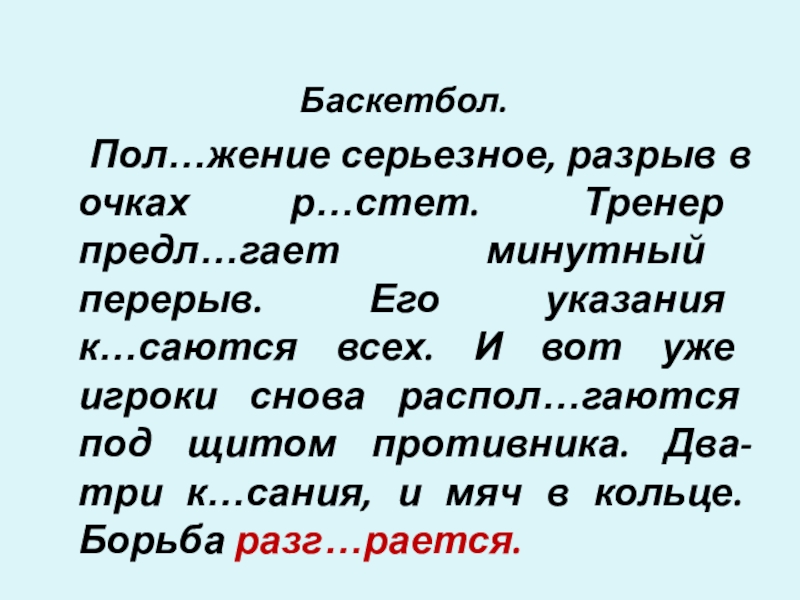 Пол…жение серьезное, разрыв в очках р…стет. Тренер предл…гает минутный перерыв. Его указания к…саются всех. И вот уже игроки снова распол…гаются под щитом противника. Два-три к…сания, и мяч в кольце. Борьба разг…рается.