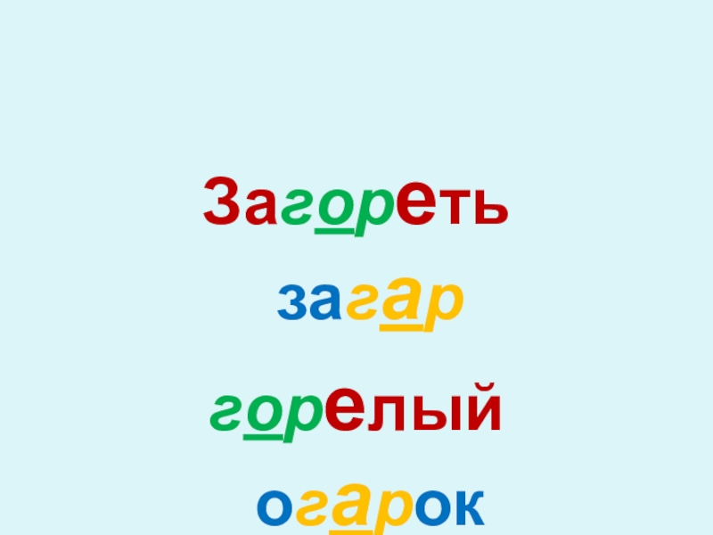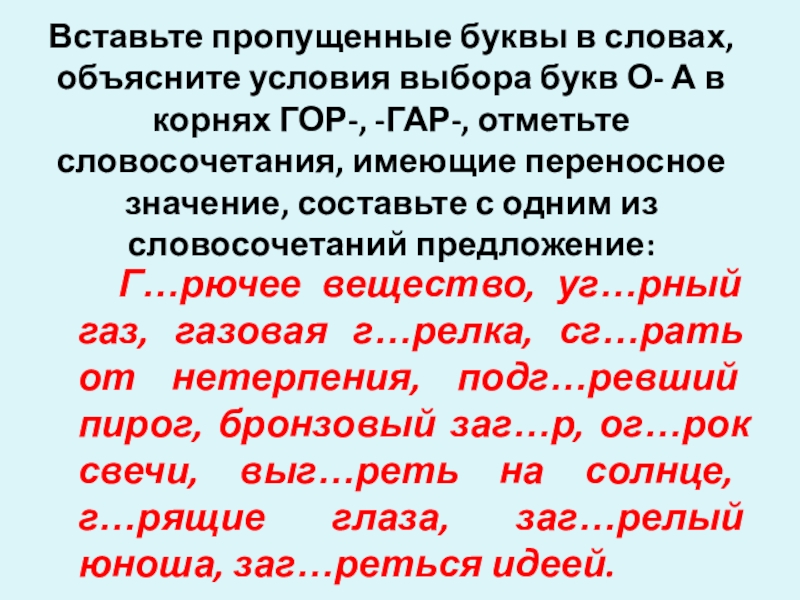 Г…рючее вещество, уг…рный газ, газовая г…релка, сг…рать от нетерпения, подг…ревший пирог, бронзовый заг…р, ог…рок свечи, выг…реть на солнце, г…рящие глаза, заг…релый юноша, заг…реться идеей.