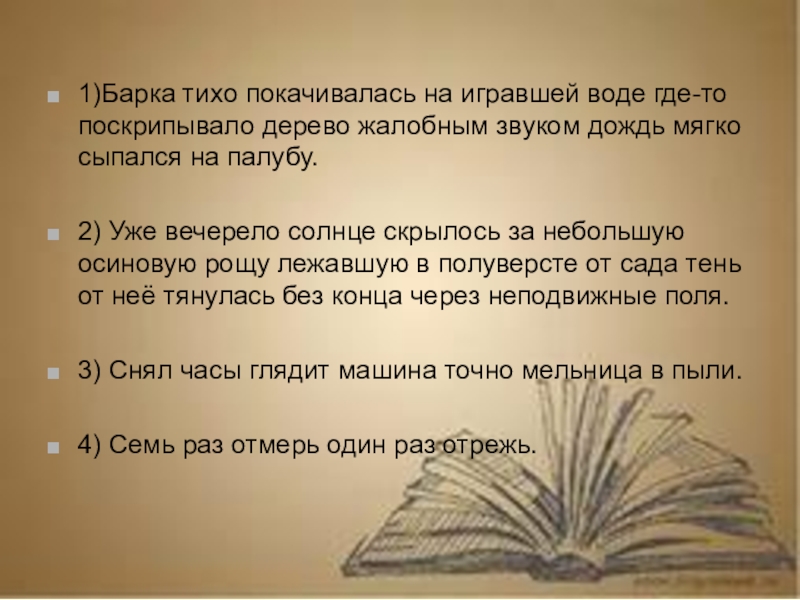 1)Барка тихо покачивалась на игравшей воде где-то поскрипывало дерево жалобным звуком дождь мягко сыпался на палубу. 2) Уже вечерело солнце скрылось за небольшую осиновую рощу лежавшую в полуверсте от сада тень от неё тянулась без конца