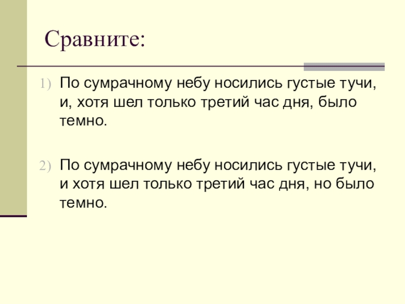 Сравните:По сумрачному небу носились густые тучи, и, хотя шел только третий час дня, было темно.По сумрачному небу