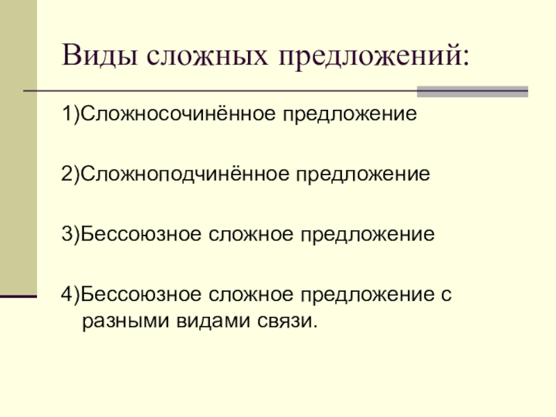 Виды сложных предложений:1)Сложносочинённое предложение2)Сложноподчинённое предложение3)Бессоюзное сложное предложение4)Бессоюзное сложное предложение с разными видами связи.