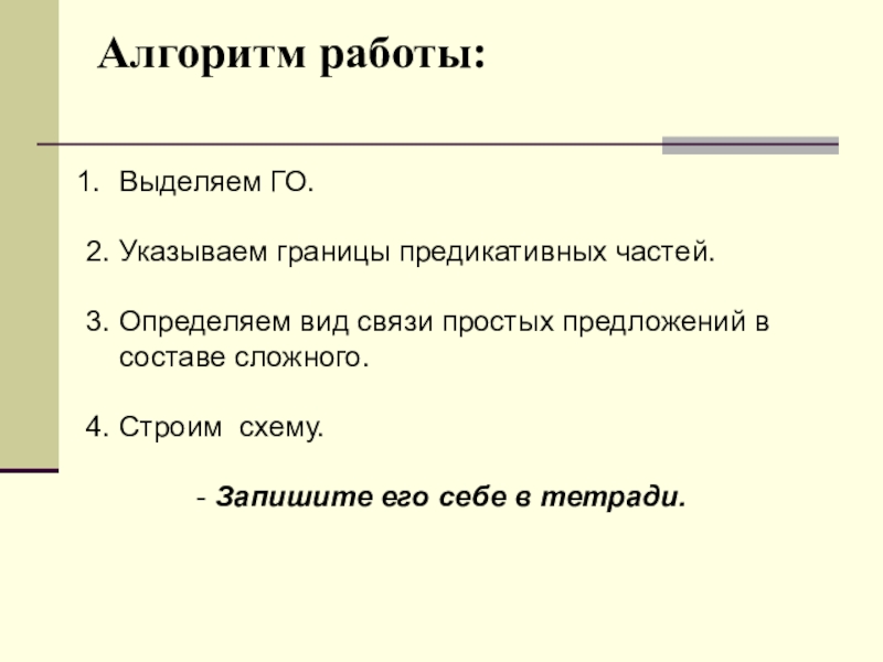 Алгоритм работы:  Выделяем ГО.2. Указываем границы предикативных частей.3. Определяем вид связи простых предложений в составе сложного.4.