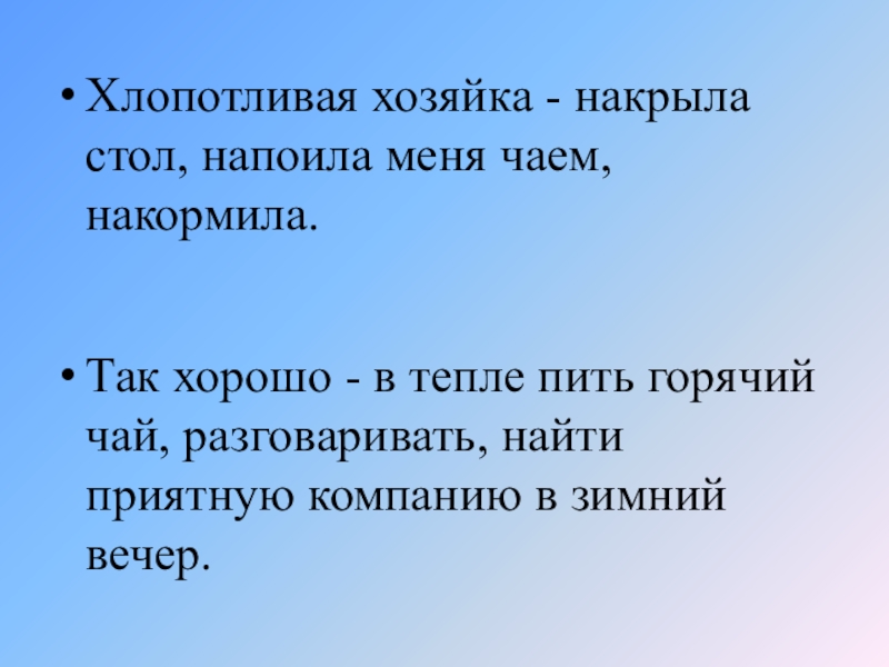 Хлопотливая хозяйка - накрыла стол, напоила меня чаем, накормила. Так хорошо - в тепле пить горячий чай, разговаривать, найти приятную компанию в зимний вечер.