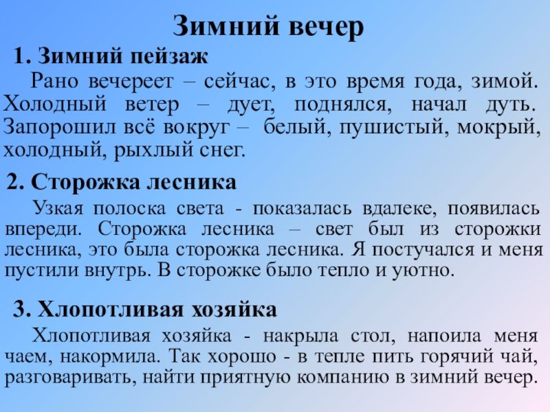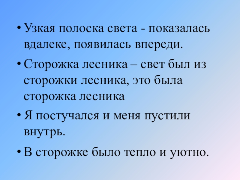 Узкая полоска света - показалась вдалеке, появилась впереди. Сторожка лесника – свет был из сторожки лесника, это была сторожка лесника. Я постучался и меня пустили внутрь. В сторожке было тепло и уютно.