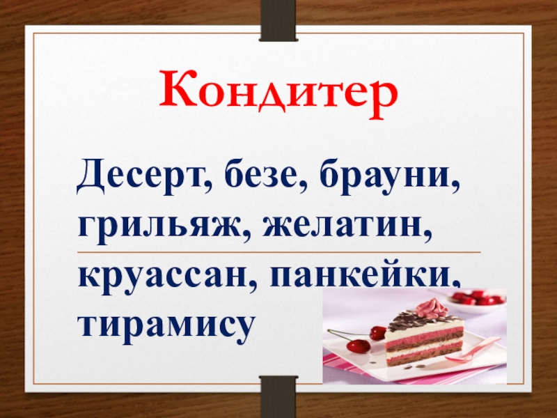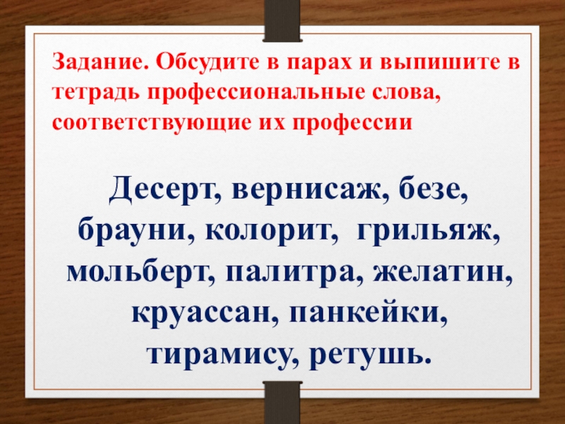 Задание. Обсудите в парах и выпишите в тетрадь профессиональные слова, соответствующие их профессииДесерт, вернисаж, безе, брауни, колорит,