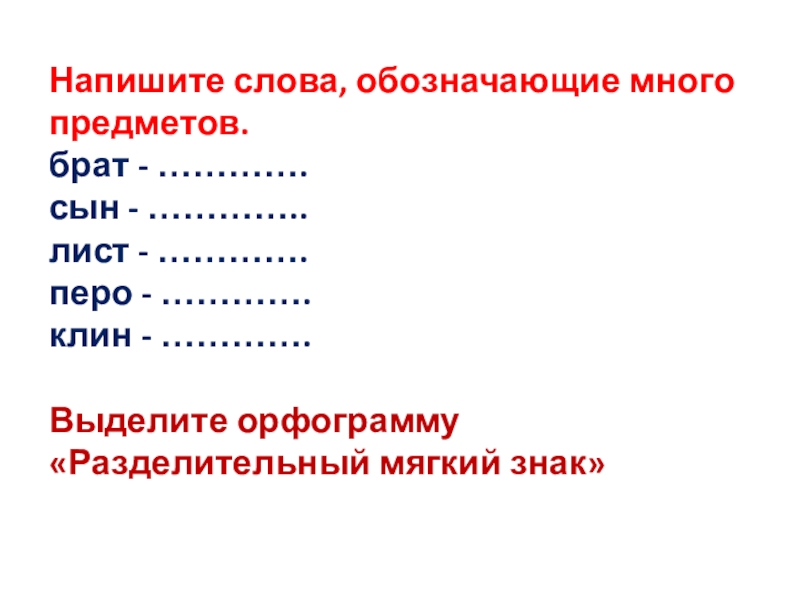 Напишите слова, обозначающие много предметов.брат - ………….сын - …………..лист - ………….перо - ………….клин - ………….Выделите орфограмму «Разделительный