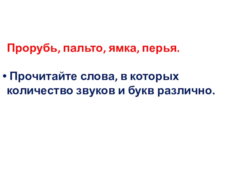 Прорубь, пальто, ямка, перья. Прочитайте слова, в которых количество звуков и букв различно.