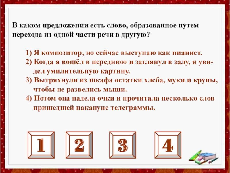 B каком предложении есть слово, образованное путем перехода из одной части