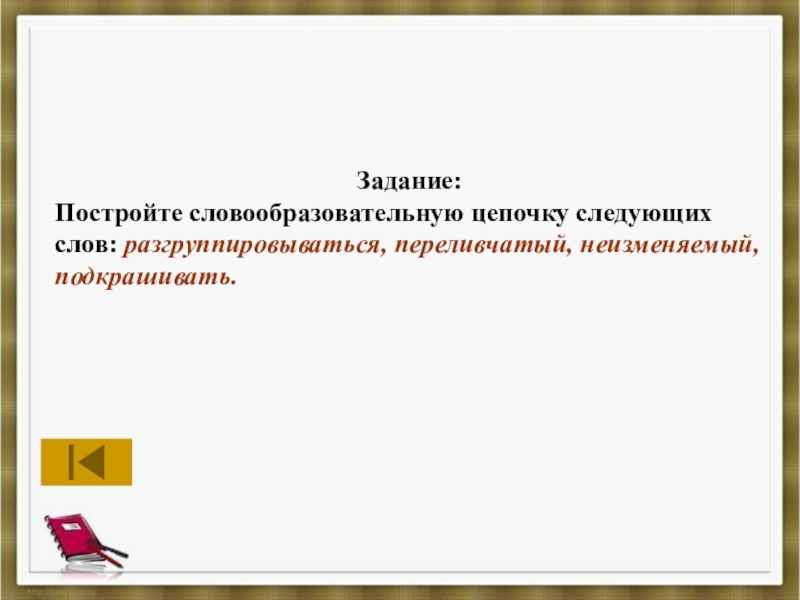 Постройте словообразовательную цепочку следующих слов: разгруппировываться, переливчатый, неизменяемый, подкрашивать.