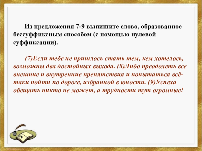 (7)Если тебе не пришлось стать тем, кем хотелось, возможны два достойных выхода. (8)Либо преодолеть все внешние и внутренние препятствия и попытаться всё-таки пойти по дороге, избранной в юности. (9)Успеха обещать никто не может, а трудности тут огромные!