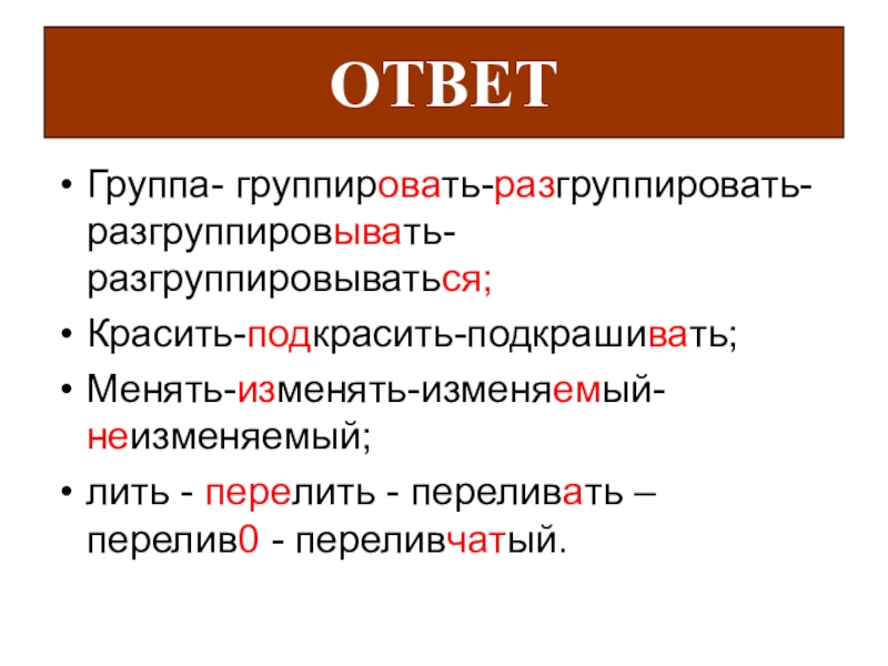 Слайд 38Группа- группировать-разгруппировать- разгруппировывать-разгруппировываться;