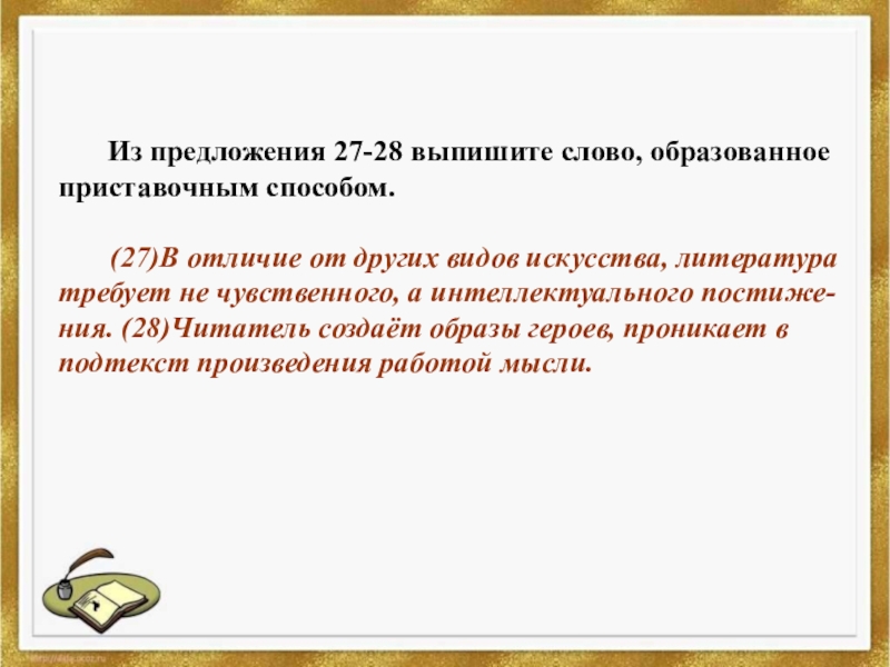 (27)В отличие от других видов искусства, литература требует не чувственного, а интеллектуального постиже-ния. (28)Читатель создаёт образы героев, проникает в