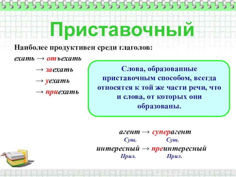 Слова, образованные приставочным способом, всегда относятся к той же части речи, что и слова, от которых они образованы.