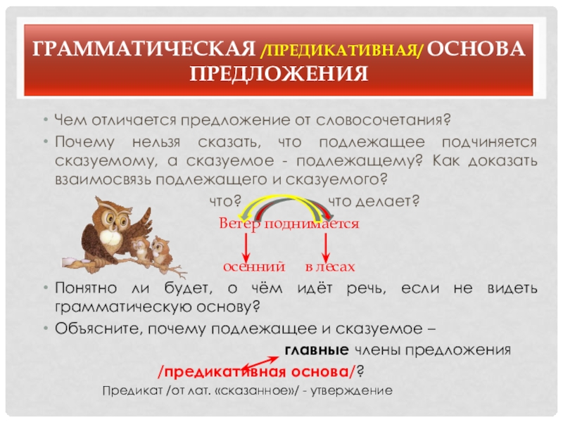 грамматическая основа, однородные члены предложения, сочетание знаменательного и служебного слов.