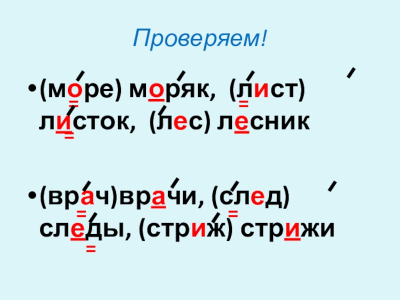 Проверяем!(море) моряк, (лист) листок, (лес) лесник(врач)врачи, (след) следы, (стриж) стрижи======