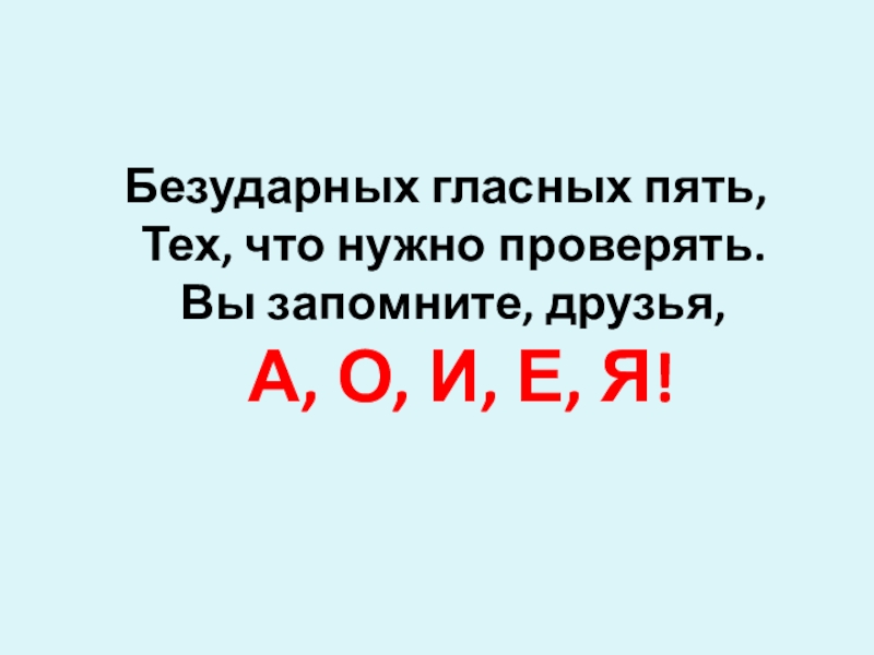 Безударных гласных пять,  Тех, что нужно проверять.  Вы запомните, друзья,   А, О, И, Е, Я!