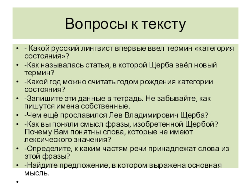 Вопросы к тексту- Какой русский лингвист впервые ввел термин «категория состояния»?-Как называлась статья, в которой Щерба ввёл