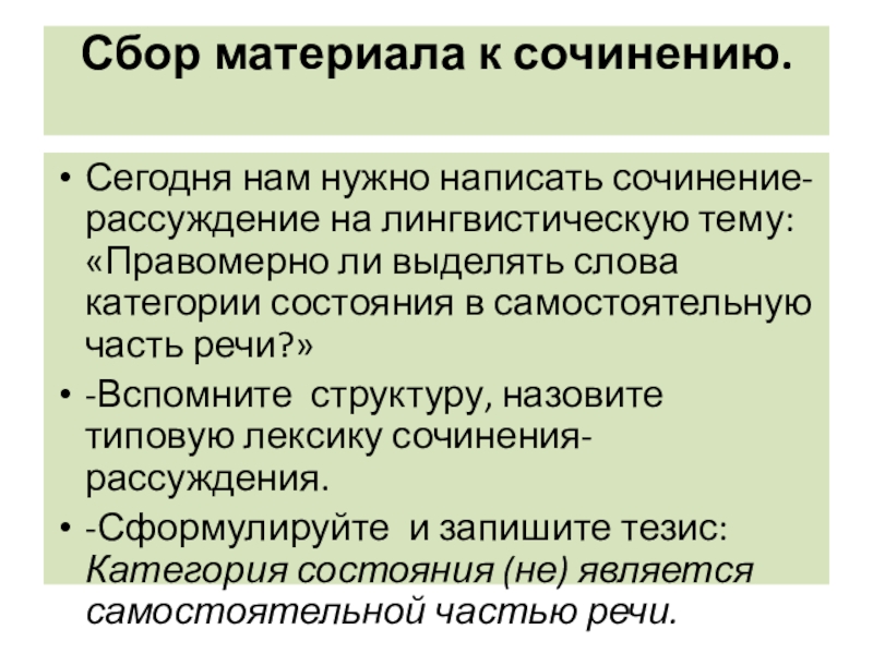 Сбор материала к сочинению.  Сегодня нам нужно написать сочинение-рассуждение на лингвистическую тему: «Правомерно ли выделять слова