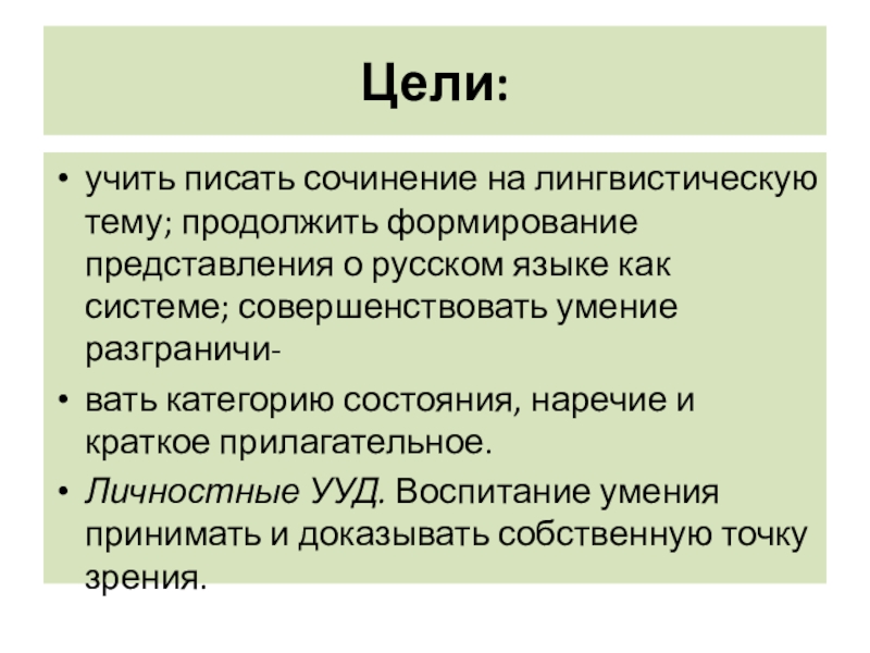 Цели:учить писать сочинение на лингвистическую тему; продолжить формирование представления о русском языке как системе; совершенствовать умение разграничи-вать категорию состояния, наречие и краткое прилагательное.Личностные УУД. Воспитание умения принимать и доказывать собственную точку зрения.