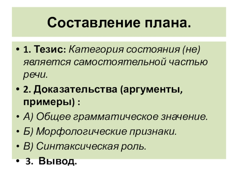 Составление плана.1. Тезис: Категория состояния (не) является самостоятельной частью речи. 2. Доказательства (аргументы, примеры) : А) Общее