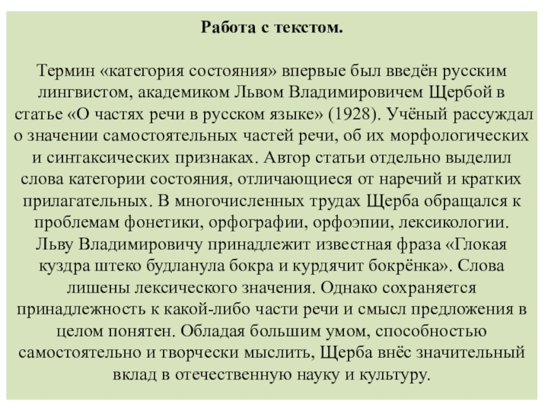 академиком Львом Владимировичем Щербой в статье «О частях речи в русском языке» (1928). Учёный рассуждал о значении самостоятельных частей речи, об их морфологических и синтаксических признаках. Автор статьи отдельно выделил слова категории состояния, отличающиеся от наречий и кратких прилагательных. В многочисленных трудах Щерба обращался к проблемам фонетики, орфографии, орфоэпии, лексикологии. Льву Владимировичу принадлежит известная фраза «Глокая куздра штеко будланула бокра и курдячит бокрёнка». Слова лишены лексического значения. Однако сохраняется принадлежность к какой-либо части речи и смысл предложения в целом понятен. Обладая большим умом, способностью самостоятельно и творчески мыслить, Щерба внёс значительный вклад в отечественную науку и культуру.