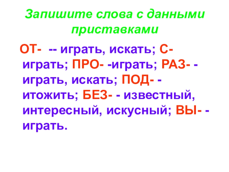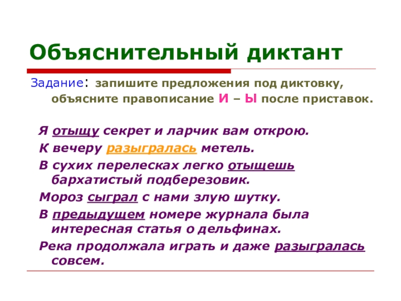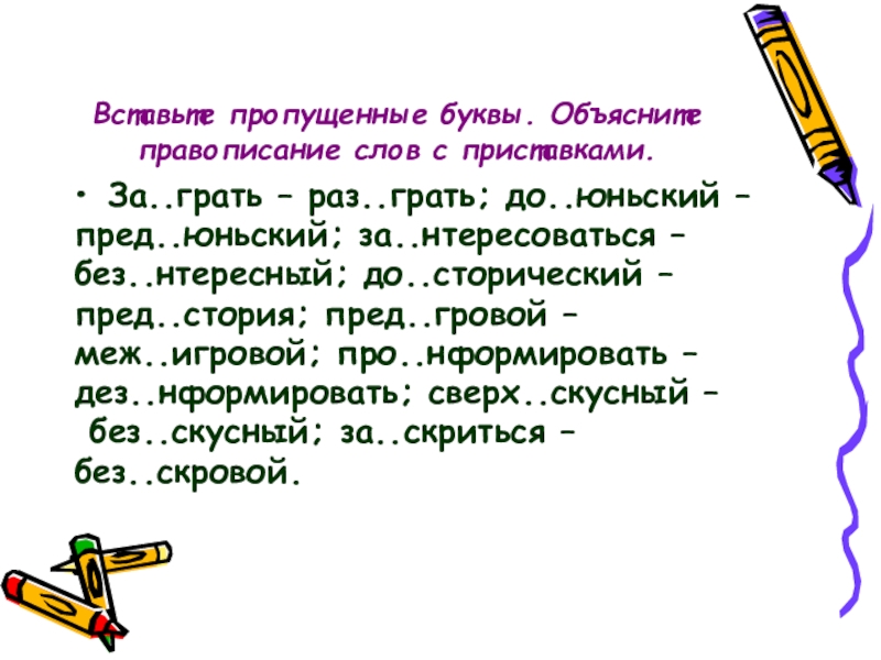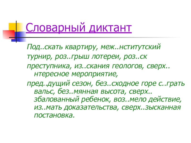 Сверхинтересный рассказ, разыгралась метель, отыскать клад, безымянный палец, обыграть в шашки, сыграть в футбол, дезинфекция помещений, дезориентация в пространстве, межигровой, межинститутский, подытожить заседание, небезызвестный автор, изысканный вкус, происки злодеев, приучать сызмала, суперинтересный рассказ, предынфарктное состояние.