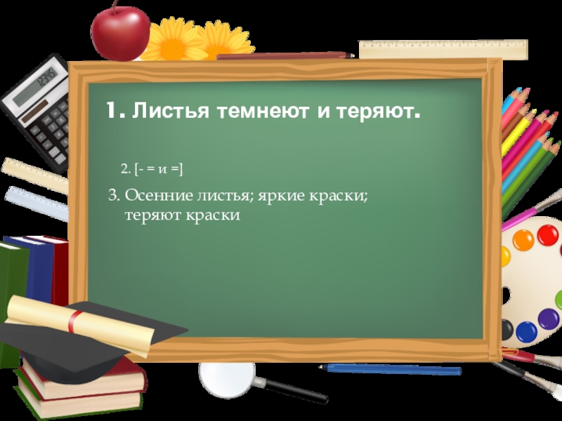 1. Листья темнеют и теряют.    2. [- = и =]3. Осенние листья; яркие